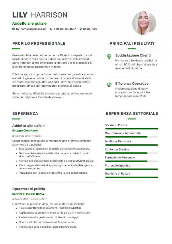 Un CV di una pagina è generalmente sufficiente per il ruolo di Addetto alle pulizie.