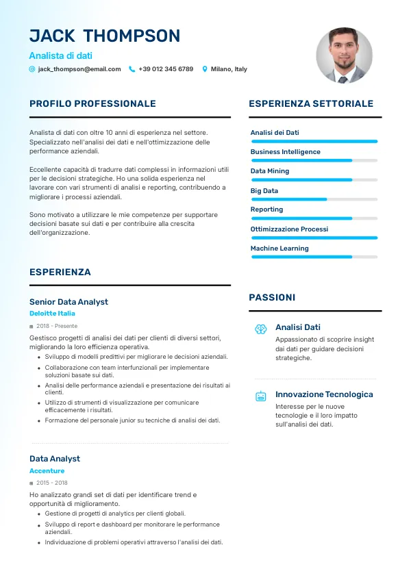 Un CV efficace per un analista di dati dovrebbe essere di 1-2 pagine, a seconda dell'esperienza. Focalizzati sulla qualità, non sulla quantità.