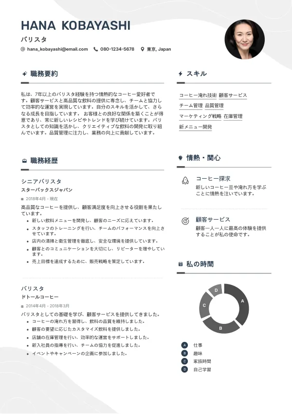 - 良い: 「情熱を持ったバリスタで、5年間の経験を有し、顧客サービスにおいて高い評価を得ています。」