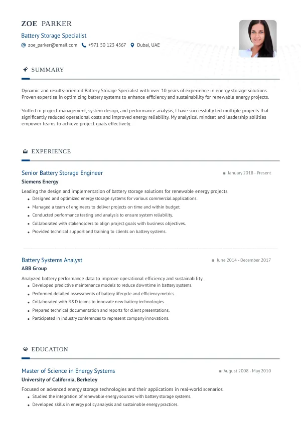 Recruiters in the UAE often rely on ATS (Applicant Tracking Systems) to filter resumes for Battery Storage Specialist positions. They look for relevant keywords, proper formatting, and clear structures. Many candidates are rejected for mistakes they may not even notice, which is why an external review can be invaluable.