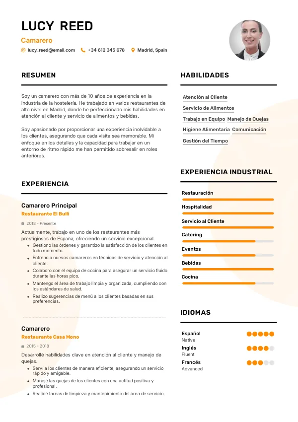 - Elimina cualquier información que no esté relacionada con el puesto de camarero y asegúrate de que todo lo que incluyas esté alineado con el rol.