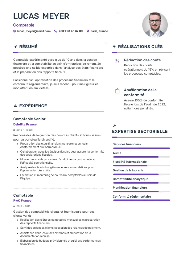 Utilisez des termes spécifiques du domaine comme 'comptabilité analytique', 'déclarations fiscales' et d'autres compétences techniques.