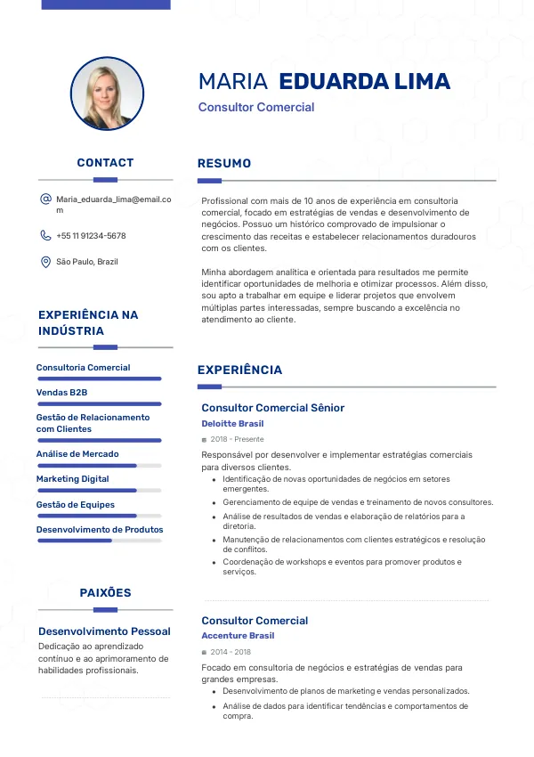 - Melhor: "Consultor Comercial com 5 anos de experiência em vendas B2B, especializado em estratégias de crescimento."