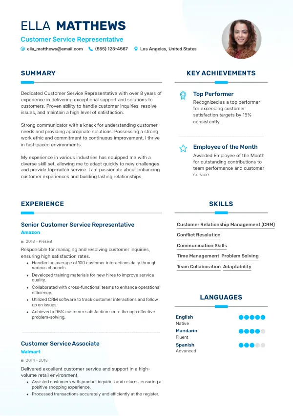 - Better: “Resolved over 200 customer inquiries per week, achieving a 95% satisfaction rate.”