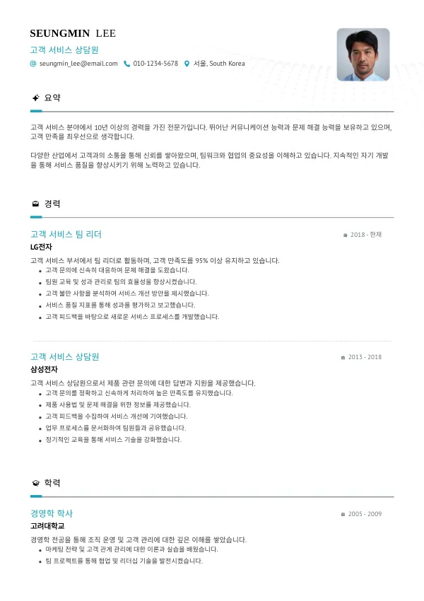 고객 서비스 관련 경험과 기술을 강조하고, 명확한 형식을 유지하세요.