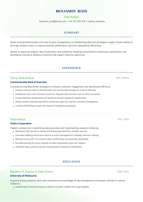 Recruiters in Australia look for specific skills and experiences when evaluating resumes for Data Analyst positions. They often rely on Applicant Tracking Systems (ATS) to filter candidates based on keyword relevance and formatting. Many candidates don't realize that they may be rejected for issues they never notice. A thorough review of your resume can help you identify these hidden mistakes.