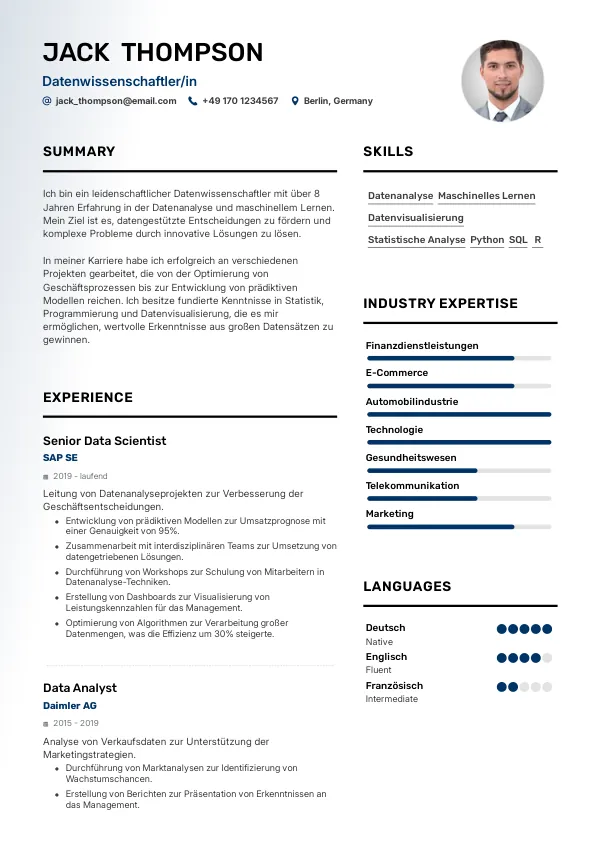 Als Datenwissenschaftler/in in Deutschland sind Ihre Fähigkeiten und Qualifikationen entscheidend, um in einem wettbewerbsintensiven Arbeitsmarkt erfolgreich zu sein. Oftmals scheitern Bewerber daran, ein Vorstellungsgespräch zu bekommen, weil ihr Resume oder CV vermeidbare Fehler aufweist. Eine frühzeitige Überprüfung Ihres Lebenslaufs kann Ihnen helfen, diese Probleme zu identifizieren und wiederholte Ablehnungen zu vermeiden.