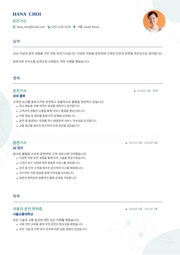 운전기사 직무에 맞는 이력서 작성은 전문성과 신뢰성을 높이는 중요한 요소입니다. 따라서, mistakes.cv와 같은 서비스로 이력서를 검토받는 것이 좋습니다.