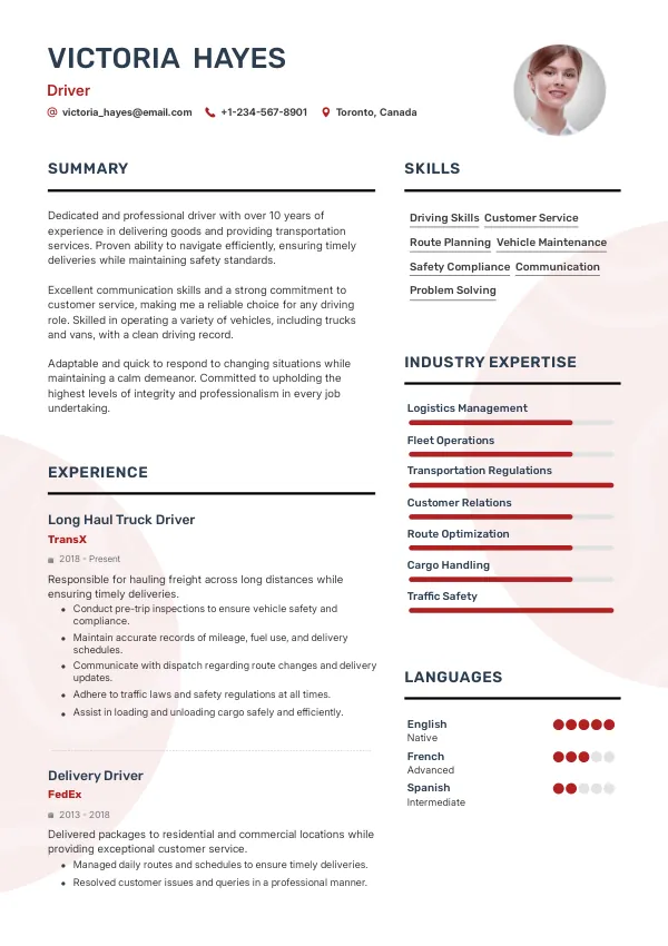- Research job postings and identify key phrases and skills commonly required for drivers in Canada. Integrate these into your resume.