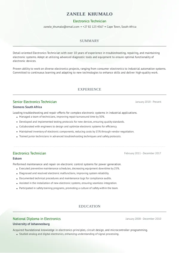 As an Electronics Technician in South Africa, your resume is your first opportunity to impress potential employers. However, many candidates overlook critical details that could significantly reduce their chances of landing an interview. Common mistakes can easily be avoided with a thorough review, so consider checking your resume with mistakes.cv to ensure it meets industry standards.