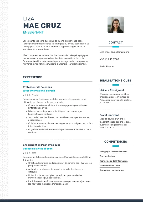 Un CV d'enseignant doit inclure une section sur les expériences d'enseignement, la formation, les compétences et une déclaration professionnelle.