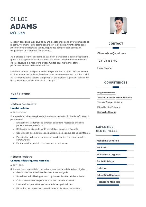 Les médecins de niveau intermédiaire doivent mettre en avant leurs réalisations et spécialités. Évitez de rester trop général et privilégiez les succès mesurables.