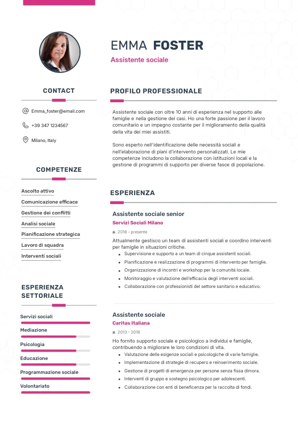 Dovrebbe includere esperienze pertinenti, competenze chiave e risultati misurabili nel campo sociale.