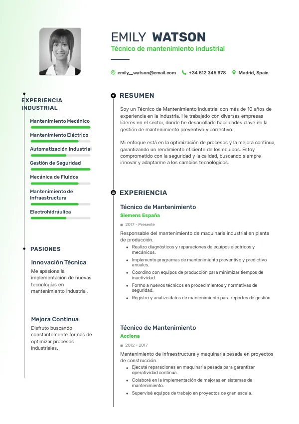 - Mejor: Incluir formación específica como "Certificación en mantenimiento industrial."