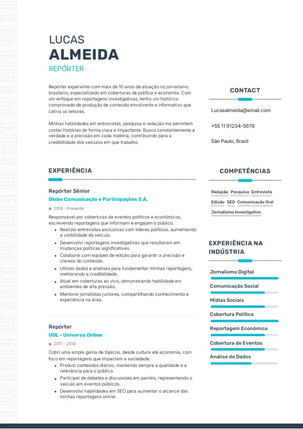 - Melhor: Currículo que inclui “reportagem investigativa”, “redação de notícias” e “entrevistas”.
