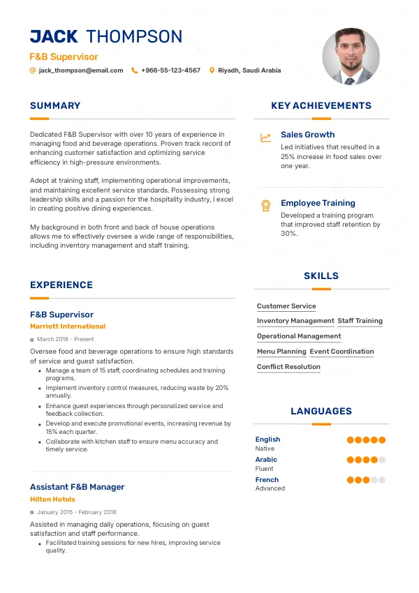 - Highlight both hard and soft skills relevant to the F&B Supervisor role.
