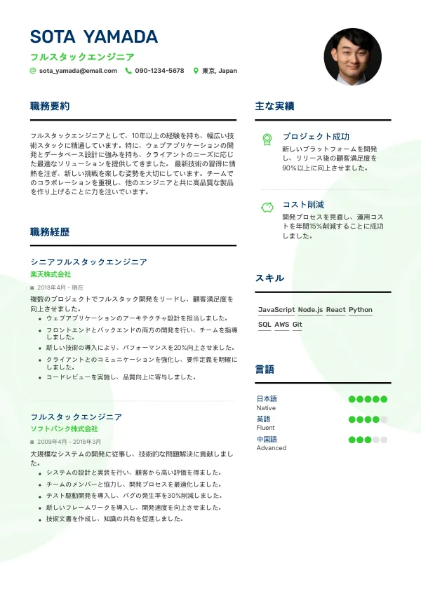 特にフルスタックエンジニアでは、技術的なスキルや経験が明確に示されている必要があります。適切なキーワードやフォーマットが求められます。