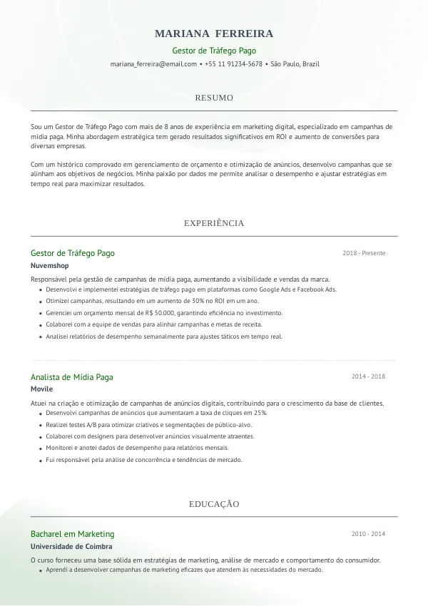 - Better: “Gestor de Tráfego Pago com 5 anos de experiência em campanhas de alta performance.”.