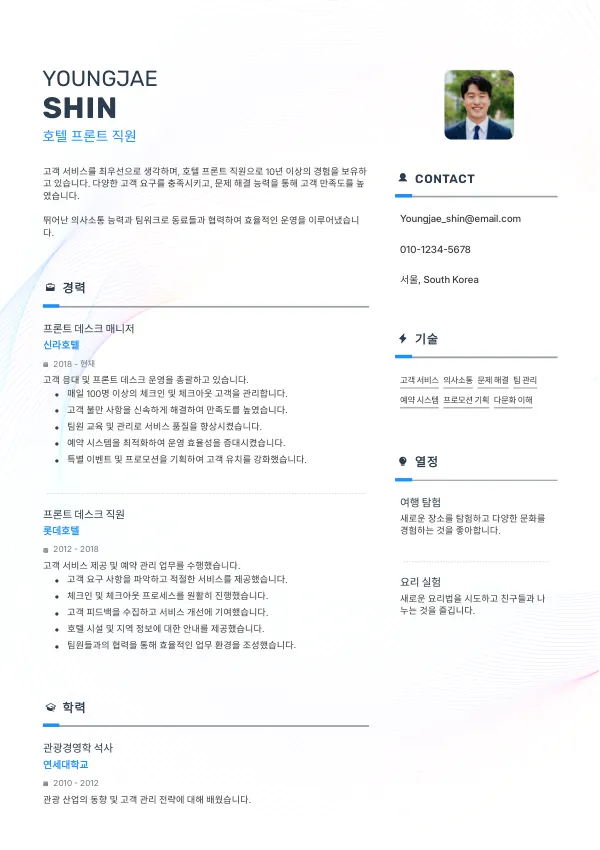 호텔 프론트 직원으로서 성공적인 취업을 위해, 이력서의 실수를 점검하는 것이 필수적입니다. mistakes.cv를 통해 이력서를 전문가에게 리뷰받고, 경쟁력을 높이세요.