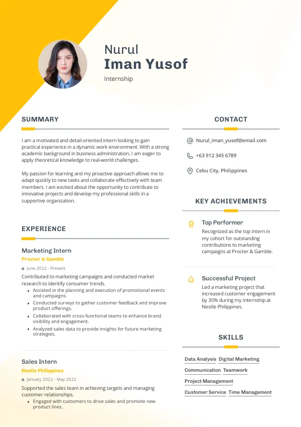 - Better: Highlighting volunteer work or projects relevant to the internship.