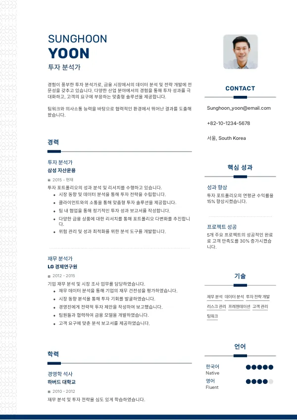 - 좋은 예: "투자 분석 프로젝트를 주도하여 20% 수익 증가를 달성했습니다."