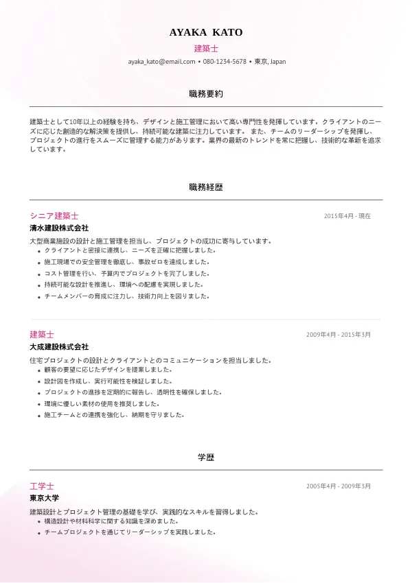 中堅の建築士は、専門的なスキルやプロジェクト管理の経験を強調する必要があります。具体的な成果や責任範囲が不足すると、次のステップに進むのが難しくなるかもしれません。エントリー職よりも具体的な業務経験を強調することが重要です。