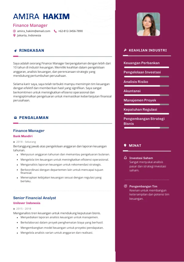 Fokus pada pengalaman di bidang keuangan, pencapaian yang terukur, dan kata kunci yang relevan.