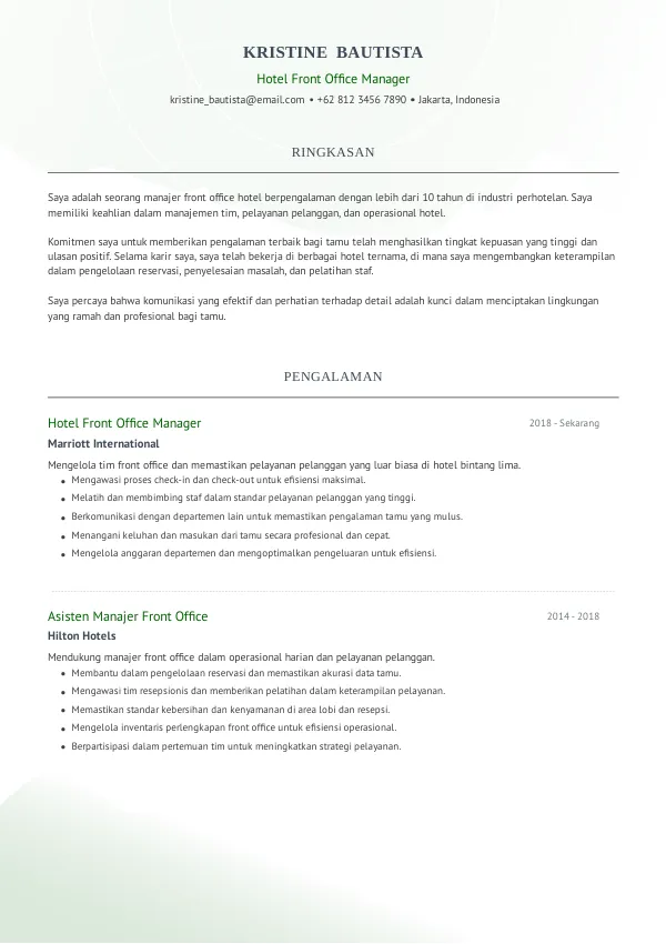 - Lebih Baik: Menyertakan pengalaman kerja di hotel atau bidang pelayanan pelanggan.