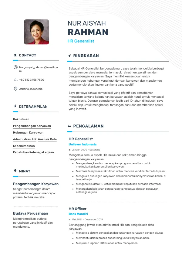Pastikan untuk mencantumkan pendidikan, pengalaman kerja relevan, dan keterampilan yang sesuai dengan posisi HR.