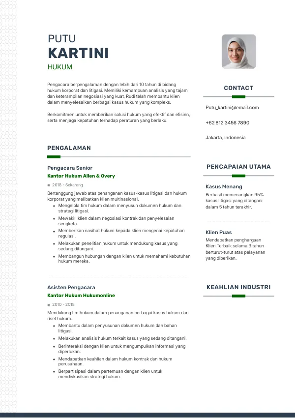 - Better: "Mengelola 20 kasus litigasi dengan tingkat kemenangan 85% selama dua tahun."