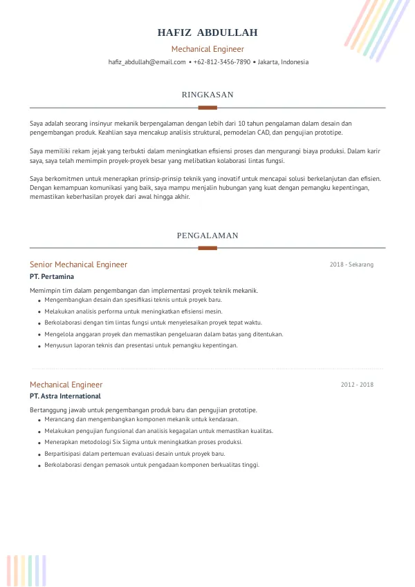 Gunakan format yang bersih, dengan subjudul yang jelas dan bullet points untuk pengalaman dan keterampilan.