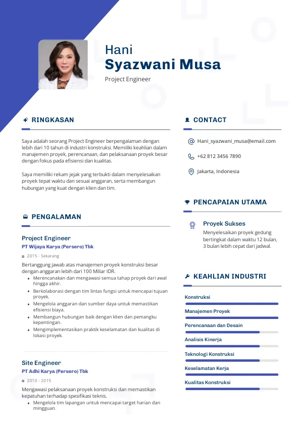 Fokus pada pengalaman proyek, keterampilan teknis, dan soft skills. Sertakan juga pencapaian yang terukur.