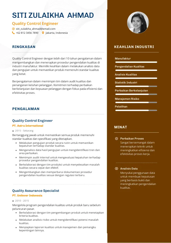 Anda harus mencantumkan pengalaman, keterampilan teknis, dan pencapaian yang relevan dengan kontrol kualitas.