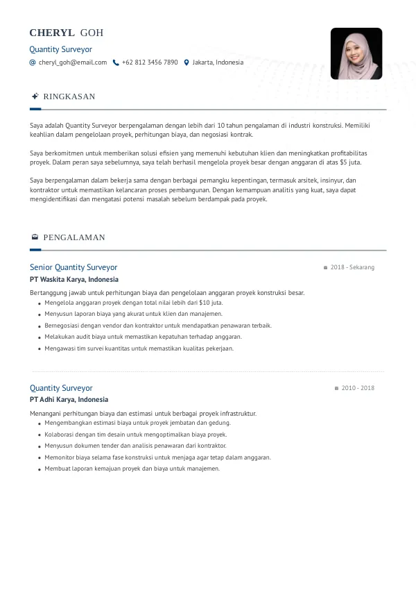 - Fokuslah pada informasi yang mendukung kualifikasi Anda sebagai Quantity Surveyor.