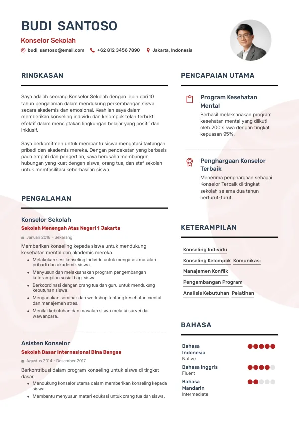 Resume harus mencakup pendidikan, pengalaman kerja, keterampilan relevan, dan sertifikasi yang mendukung peran konselor.