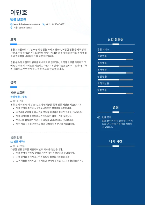 - 더 좋은: "법률 문서 작성 및 고객 상담 지원"