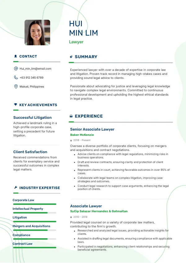 Senior lawyers must signal their leadership abilities and industry expertise. Resumes should reflect a blend of hard and soft skills, showcasing strategic impact. Include examples of mentorship, team leadership, and significant case outcomes.