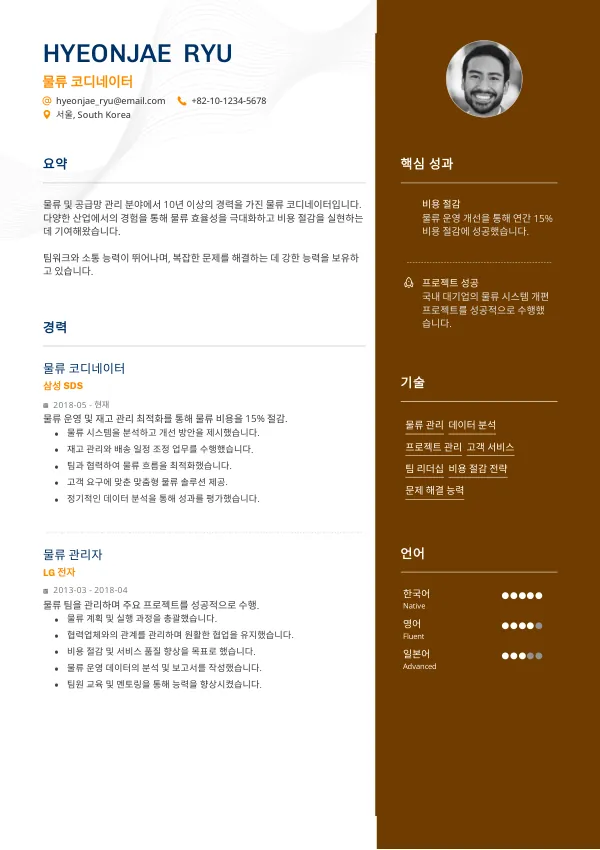 - 좋음: 3년간 XYZ 회사에서 물류 관리자로 근무하며 재고 관리 및 출고 프로세스를 최적화했습니다.