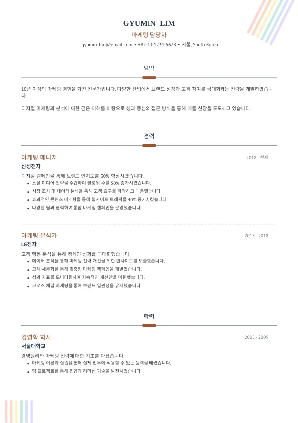 - 더 좋음: 1-2페이지 이내의 간결한 이력서.