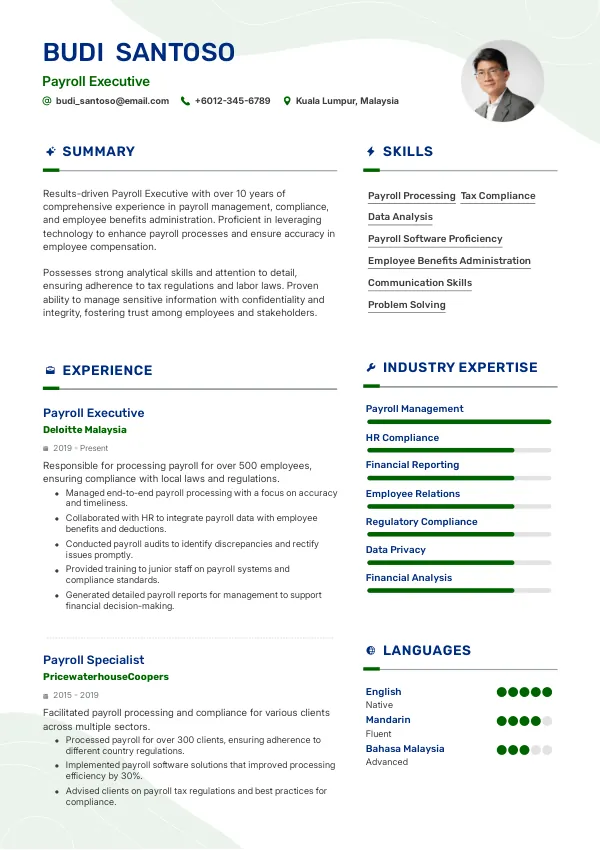 - Limit your resume to the most relevant experiences and skills that pertain to the Payroll Executive role.