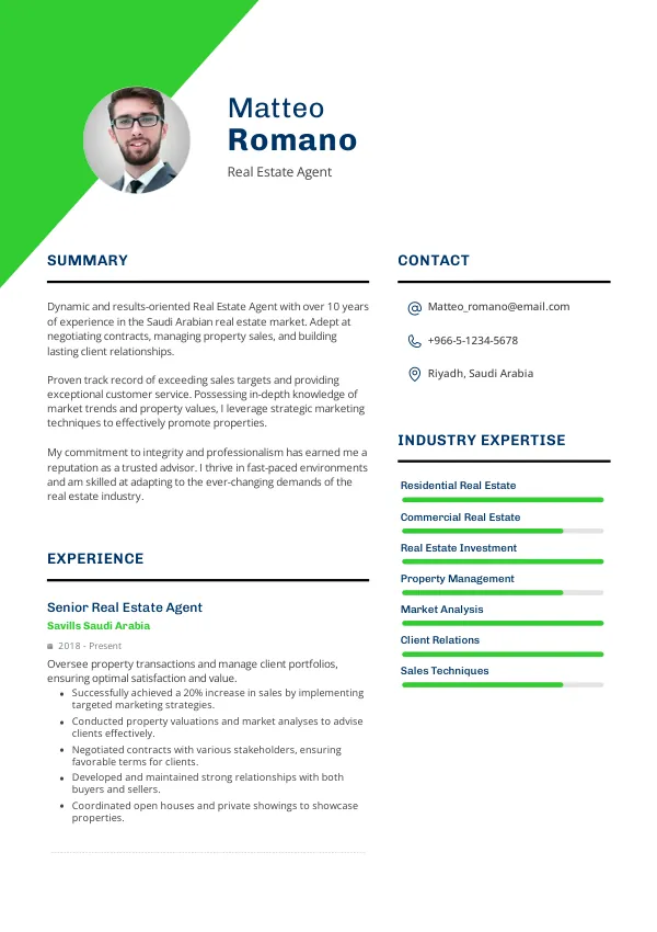Don't let your resume hold you back from securing your dream job as a real estate agent. Review, improve, or fix your resume using mistakes.cv to ensure it meets the expectations of recruiters in Saudi Arabia.