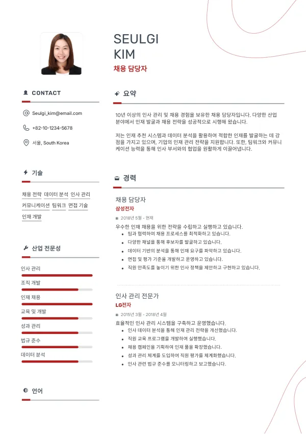 중급 채용 담당자는 경력을 기술할 때 구체적인 성과를 강조해야 합니다. 자신의 성과를 수치로 표현하는 것을 잊지 마세요.