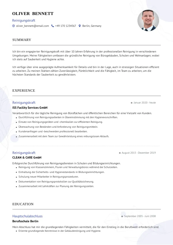 Für Reinigungskräfte ist ein einseitiger Lebenslauf in der Regel ausreichend. Konzentrieren Sie sich auf relevante Informationen.