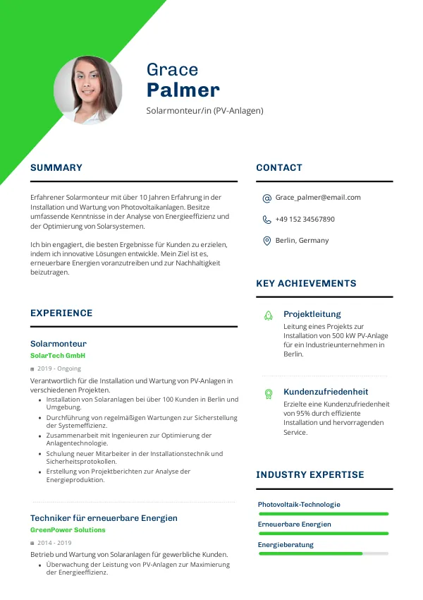 - Besser: Lebenslauf, der spezifische Erfahrungen in der Solarbranche hervorhebt.