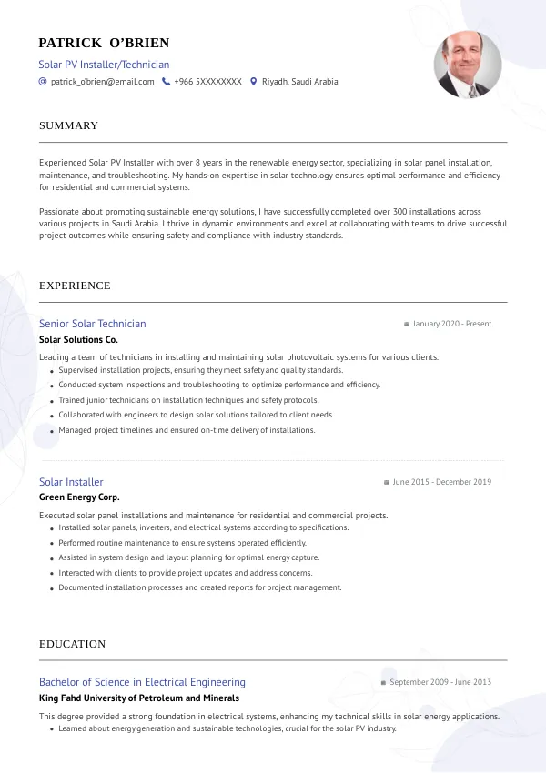 Recruiters in Saudi Arabia look for specific qualifications and relevant experience in Solar PV Installer resumes. They typically use Applicant Tracking Systems (ATS) to filter candidates based on keywords and formatting. Unfortunately, many applicants are rejected for issues that they may not even see, which is why an external review of your resume can be highly beneficial.