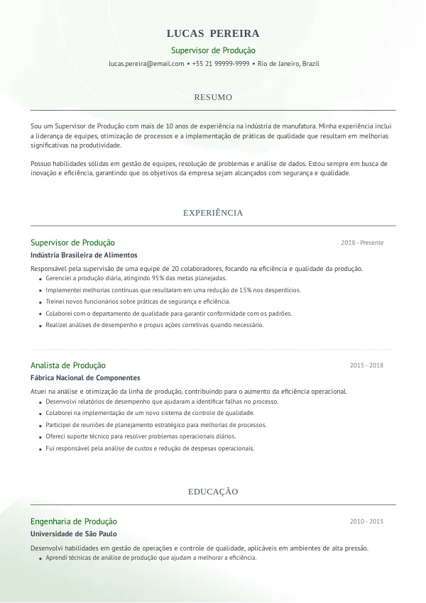 - Inclua apenas informações relevantes para a função de Supervisor de Produção.