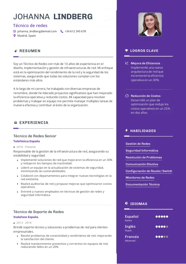 Incluye habilidades técnicas, experiencia laboral relevante, y logros cuantificables relacionados con redes.