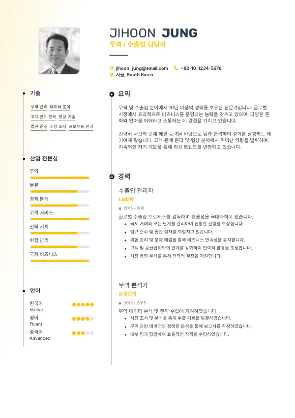 무역 / 수출입 담당자 직무에 맞는 이력서를 작성하는 것은 매우 중요합니다. 이력서를 점검하고 실수를 수정하는 것은 면접 기회를 높이는 데 큰 도움이 됩니다.