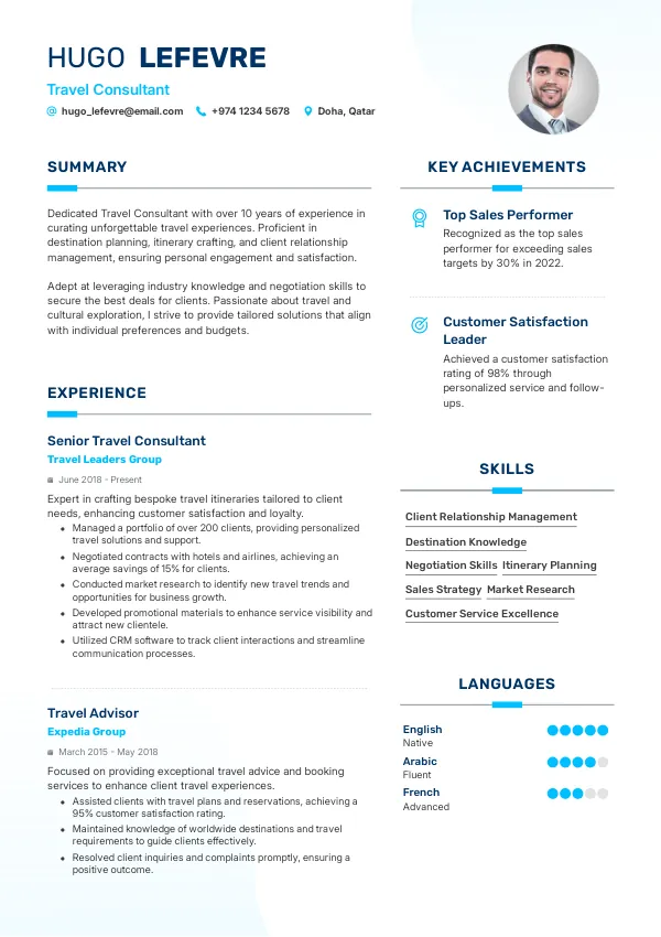 Don't let resume mistakes hold you back from your dream job as a Travel Consultant in Qatar. Review your resume for these common errors and improve your chances of landing an interview. Use mistakes.cv for a professional evaluation that can help you identify and fix issues effectively.