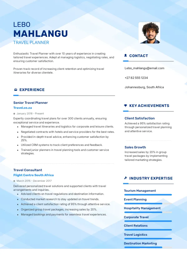 Focus on relevant experience, skills, and accomplishments tailored to the travel planning role.